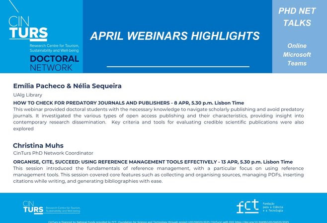 The CinTurs PhD Network hosted two PhD Net Talks webinars in April, delivered in partnership with the UAlg Library and focused on essential academic skills for doctoral researchers. On 8 April, the session "How to Check for Predatory Journals and Publishers" provided guidance on navigating scholarly publishing, exploring open access models and practical tools for assessing the