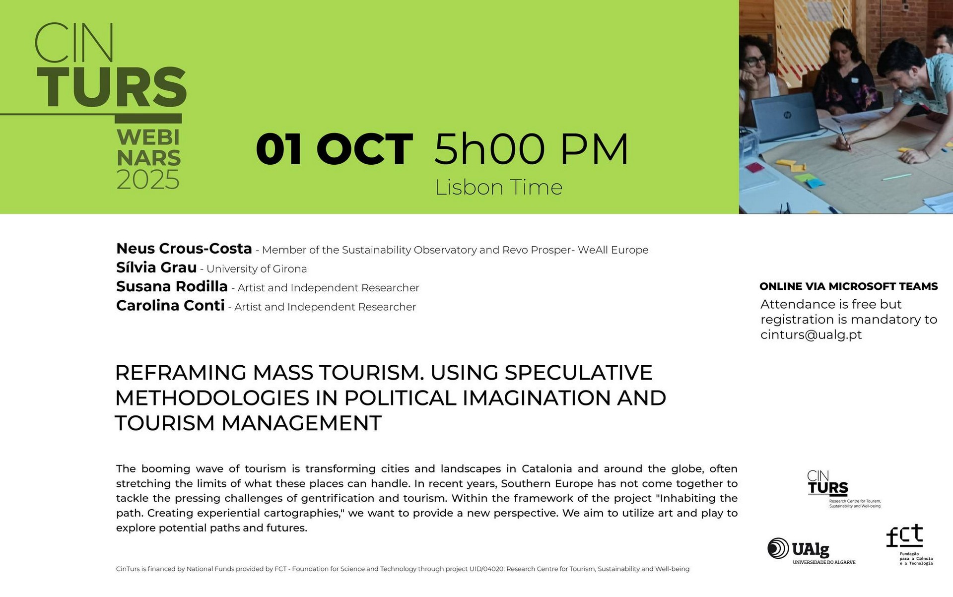 On October 1, CinTurs hosted a webinar entitled “Reframing Mass Tourism. Using Speculative Methodologies in Political Imagination and Tourism Management.” The seminar was presented by four researchers - Neus Crous-Costa, Sílvia Grau, Susana Rodilla, and Carolina Conti - who reflected on the challenges of mass tourism and its implications for landscapes and cities, especially in southern Europe.