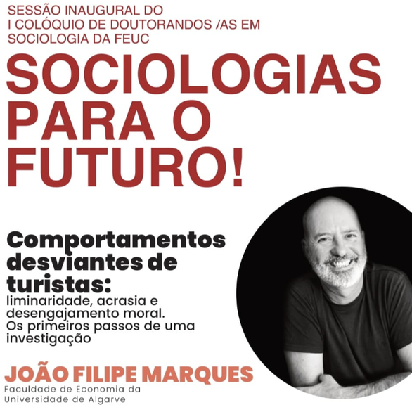 On October 2, CinTurs researcher João Filipe Marques gave the inaugural lecture at the First Conference of Doctoral Students of the Faculty of Economics of the University of Coimbra - “Sociologias para o Futuro!, with the topic “Deviant Behavior of Tourists: Liminality, Acrasia, and Moral Disengagement - First Steps of a Research Project.”